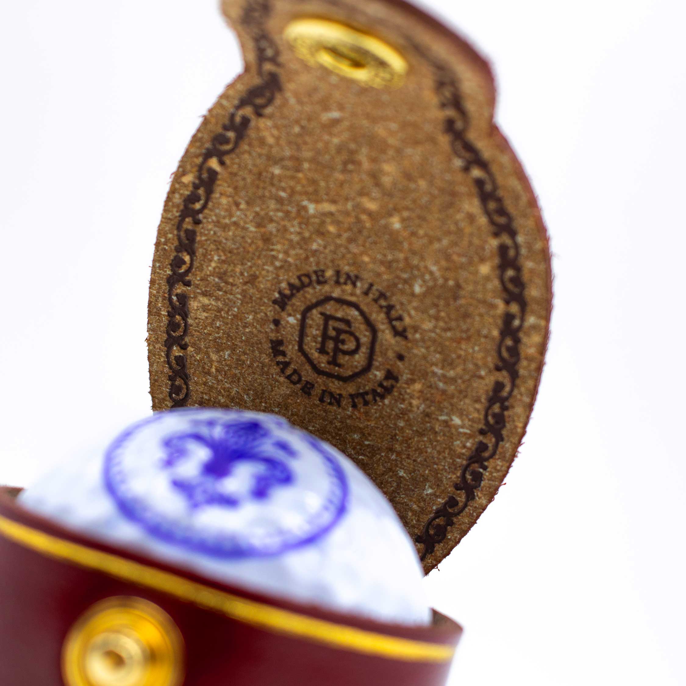 La fase successiva al taglio e assemblaggio della pelle è quella della decorazione, dove si esalta l’accessorio tramite una lavorazione tipica fiorentina, realizzata a caldo. La decorazione del porta palle, ottenibile a foglia oro o a secco, viene realizzata a mano e a caldo come si faceva in passato, e rappresenta due mazze da golf, icone di questo glorioso sport. Il porta palle è decorato anche all’interno, tramite una fantasia tipica fiorentina.