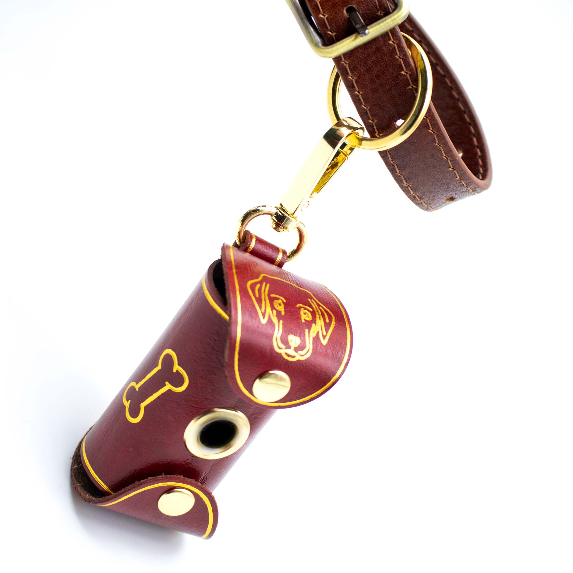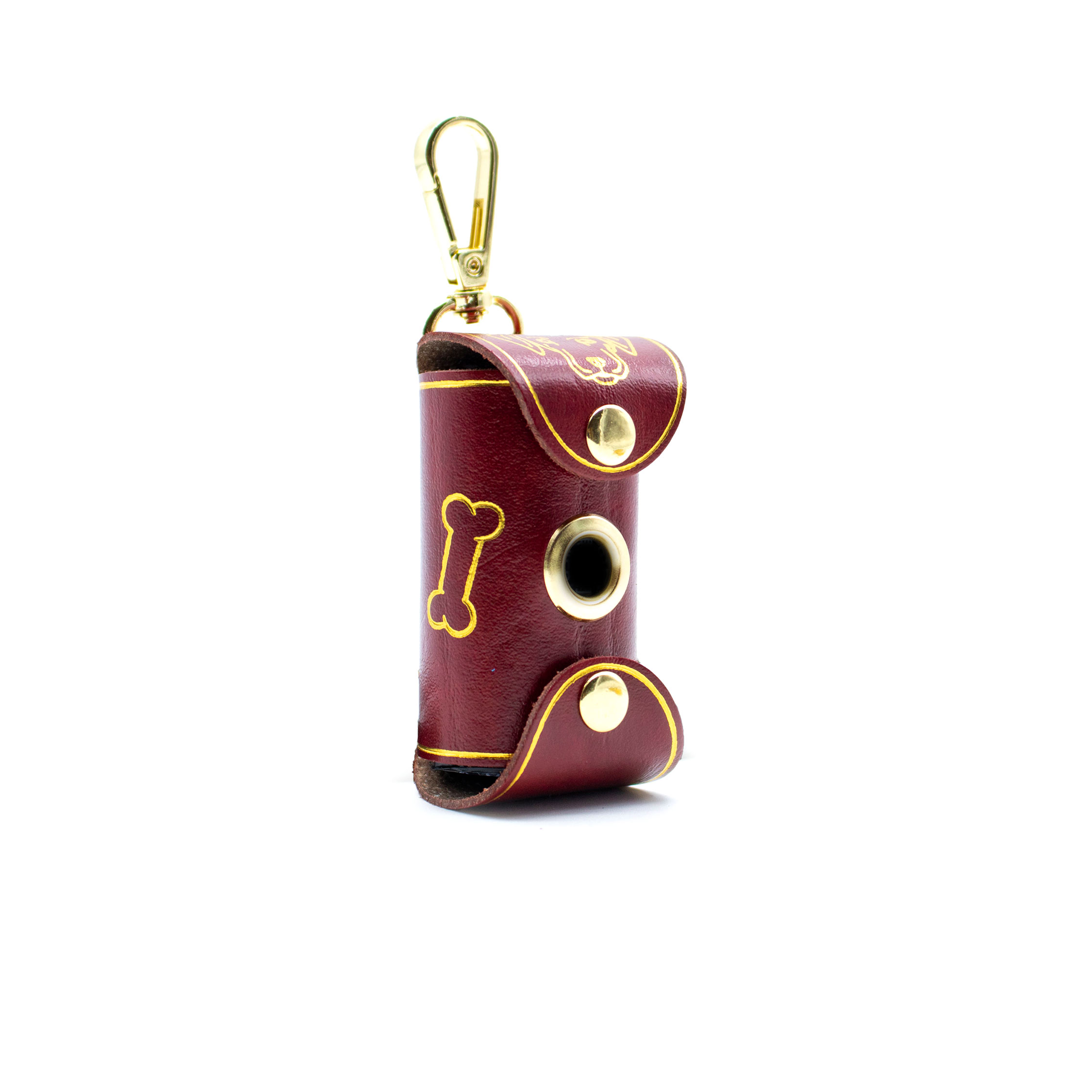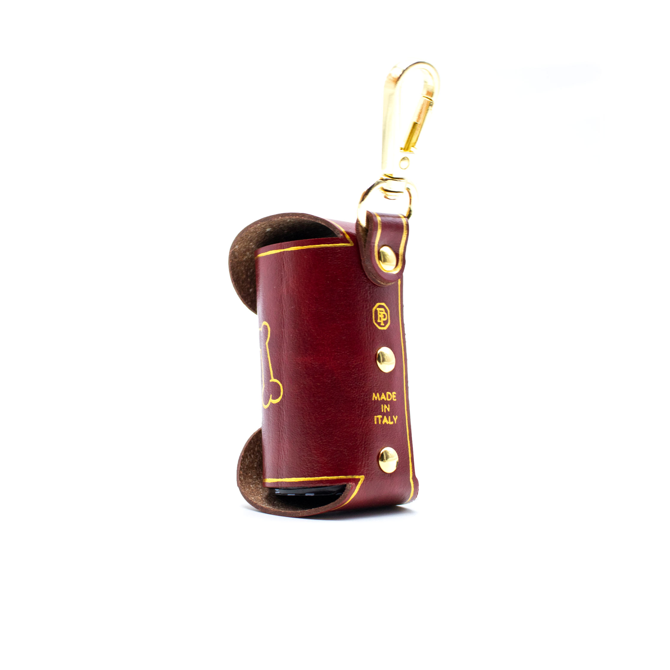 Questo porta sacchettino per cane è realizzato artigianalmente nel laboratorio FP Pelletterie di Firenze, utilizzando pelle rigenerata di alta qualità. È progettato per essere pratico e elegante, offrendo un modo comodo per trasportare i sacchettini per i bisogni del tuo cane ovunque tu vada. Un moschettone robusto consente di agganciarlo facilmente alla tua borsa o al collare del tuo animale. Il fronte è arricchito da un anellino che facilita lo strappo dei sacchettini. Un disegno stilizzato di un cane, realizzato in foglia oro o argento, completa il design.