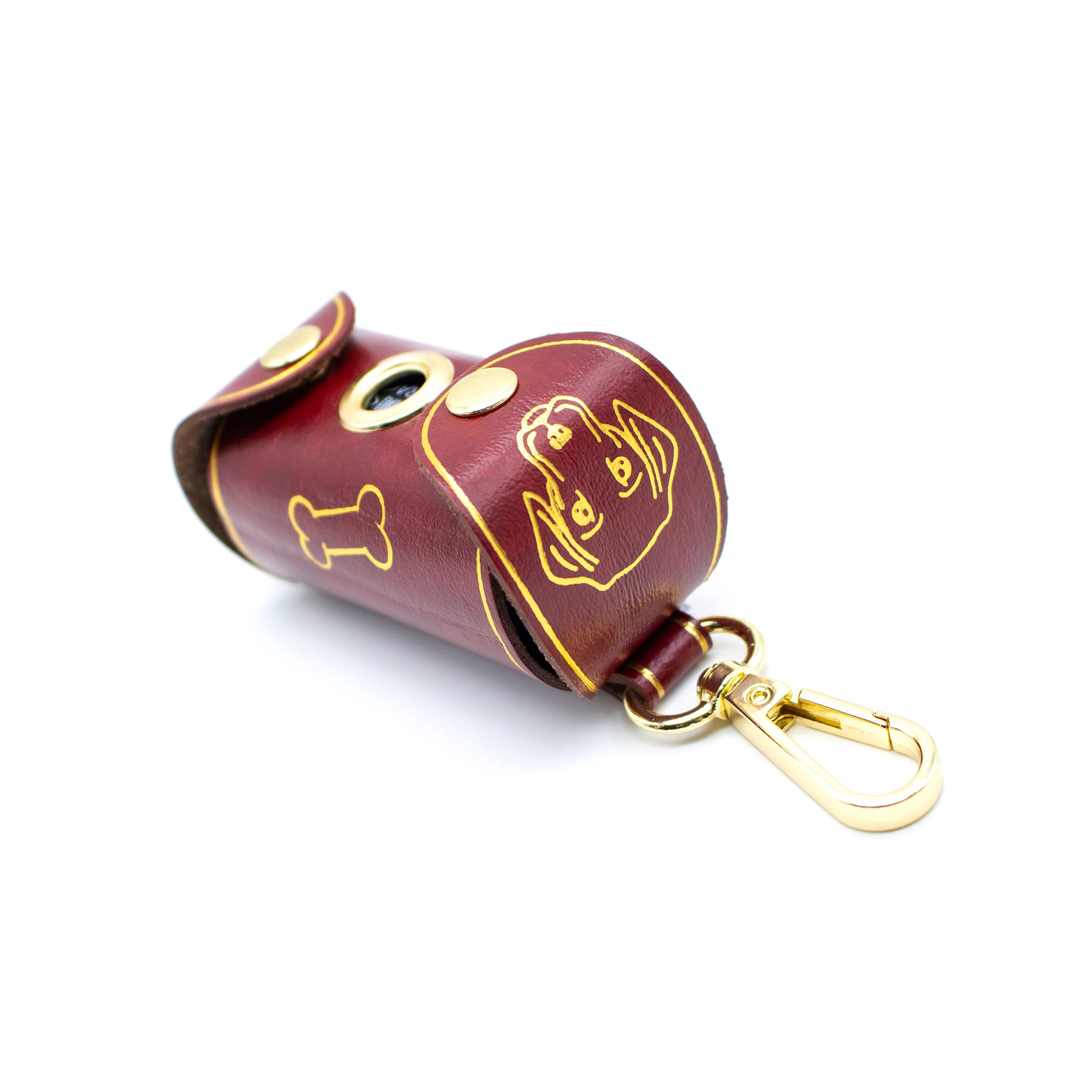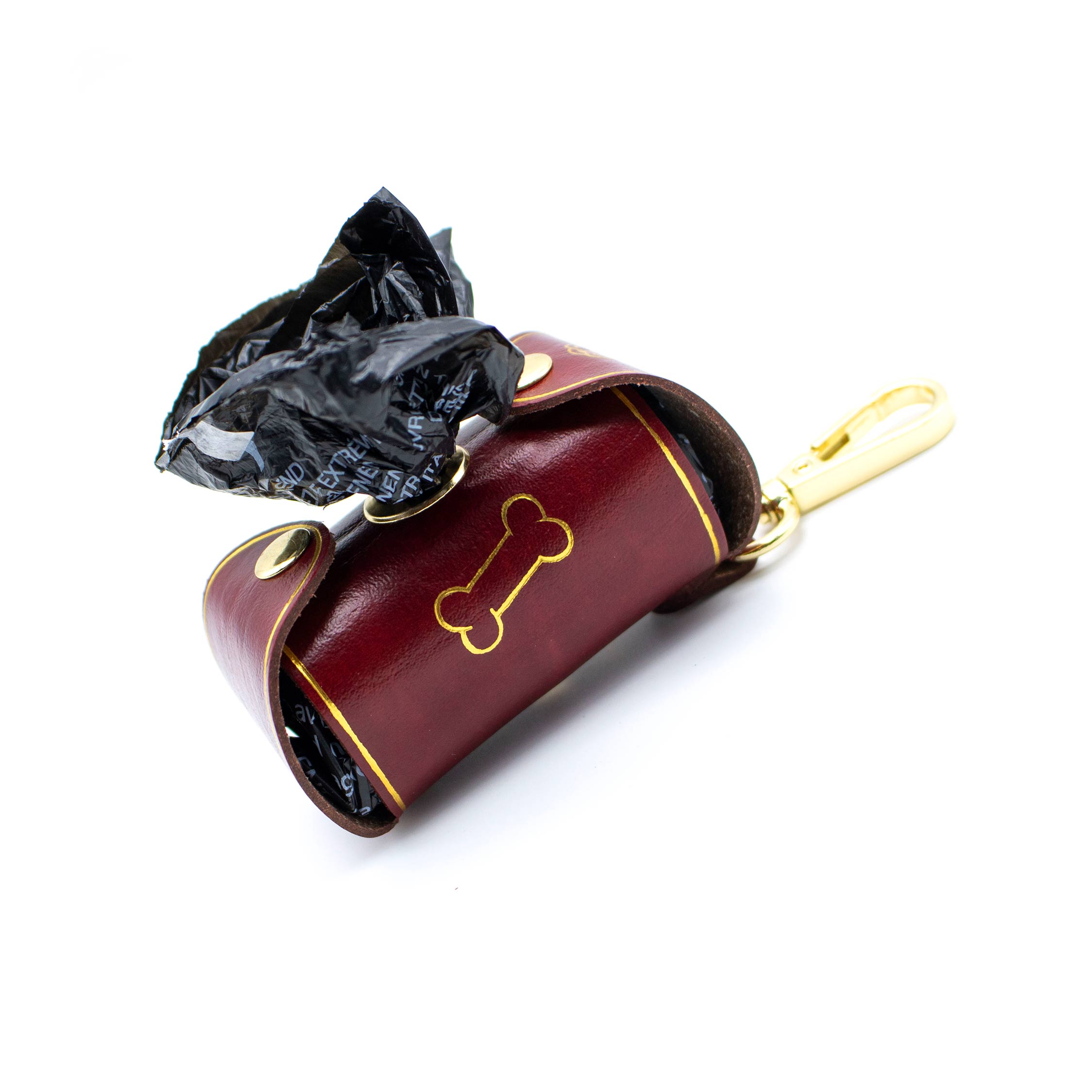 Questo porta sacchettino per cane è realizzato artigianalmente nel laboratorio FP Pelletterie di Firenze, utilizzando pelle rigenerata di alta qualità. È progettato per essere pratico e elegante, offrendo un modo comodo per trasportare i sacchettini per i bisogni del tuo cane ovunque tu vada. Un moschettone robusto consente di agganciarlo facilmente alla tua borsa o al collare del tuo animale. Il fronte è arricchito da un anellino che facilita lo strappo dei sacchettini. Un disegno stilizzato di un cane, realizzato in foglia oro o argento, completa il design.