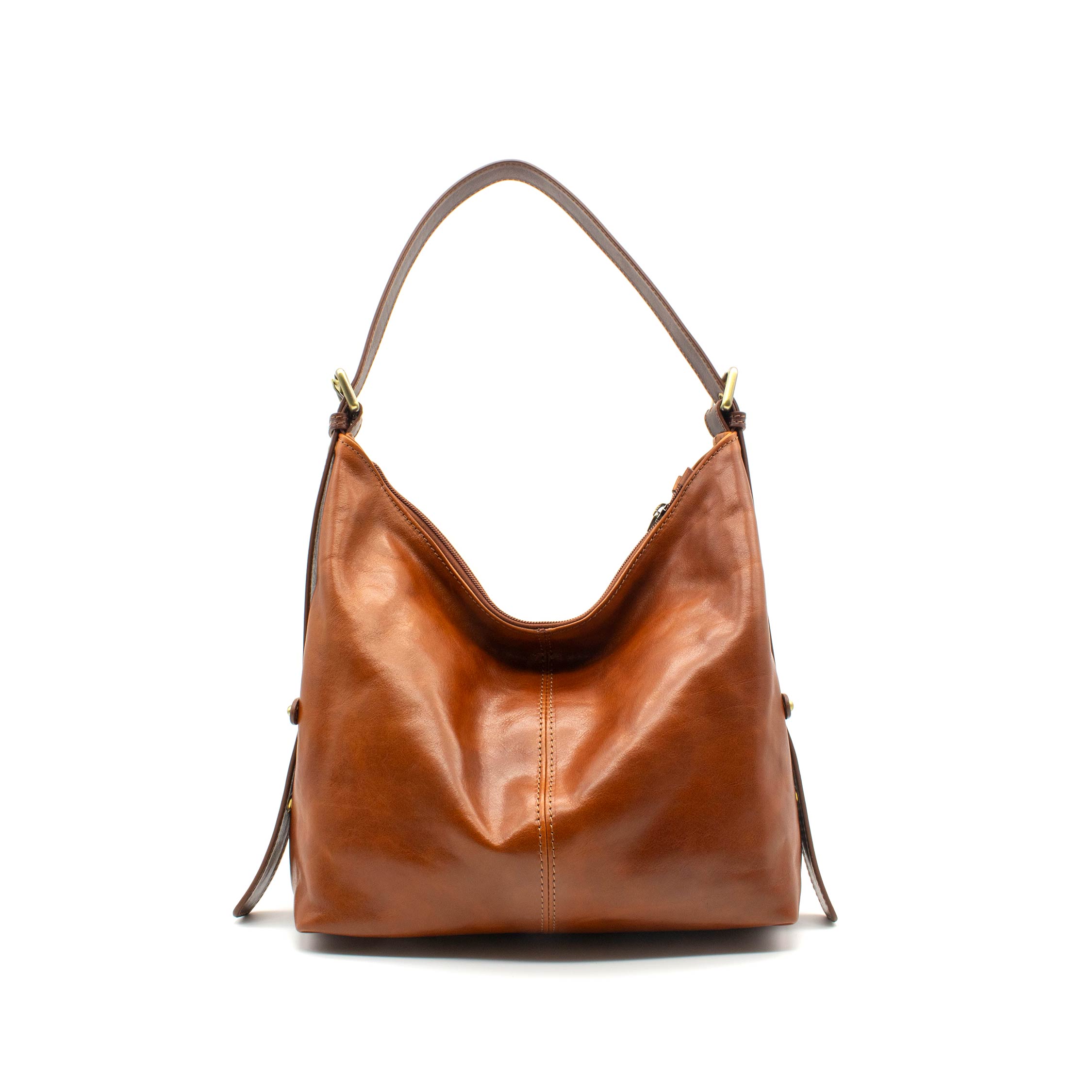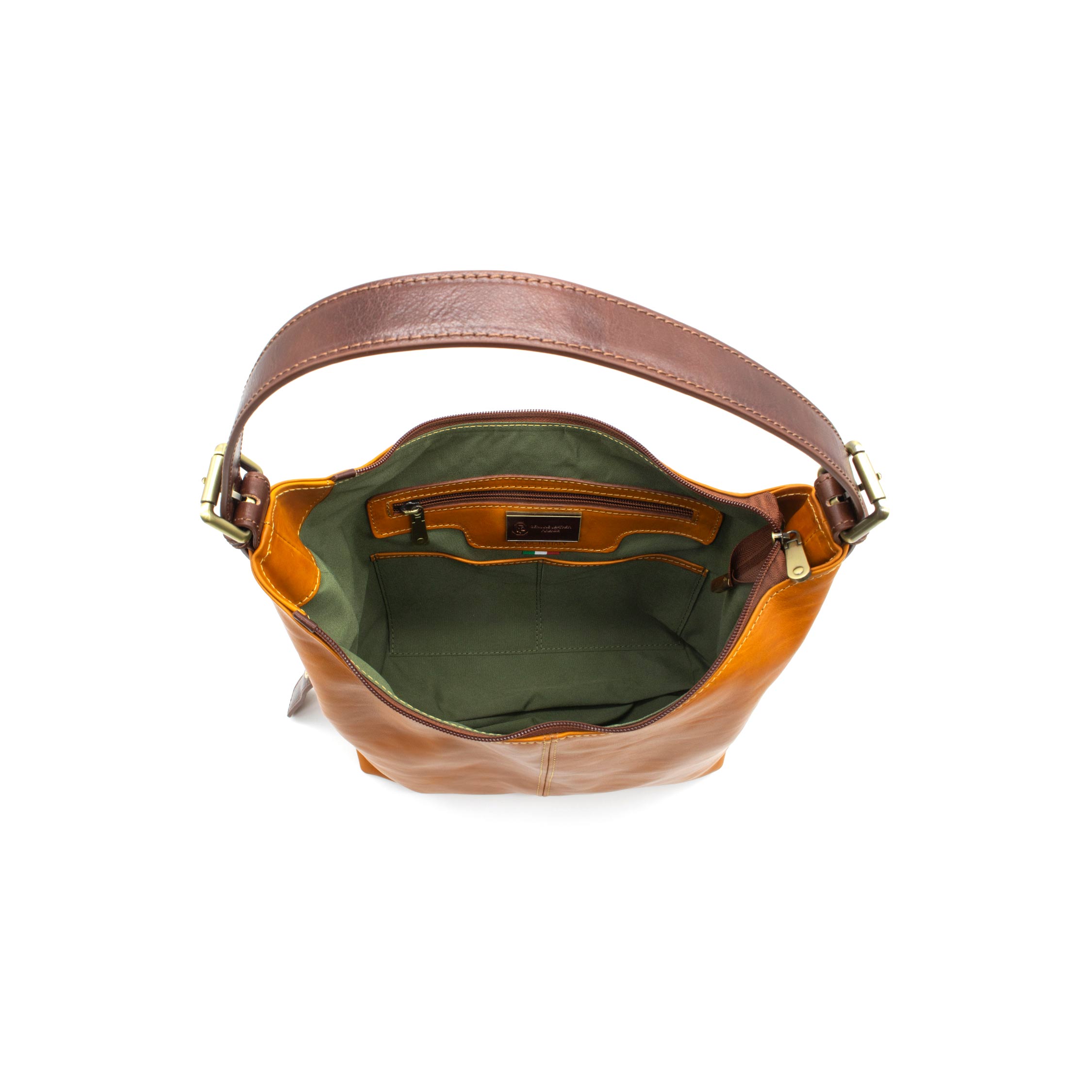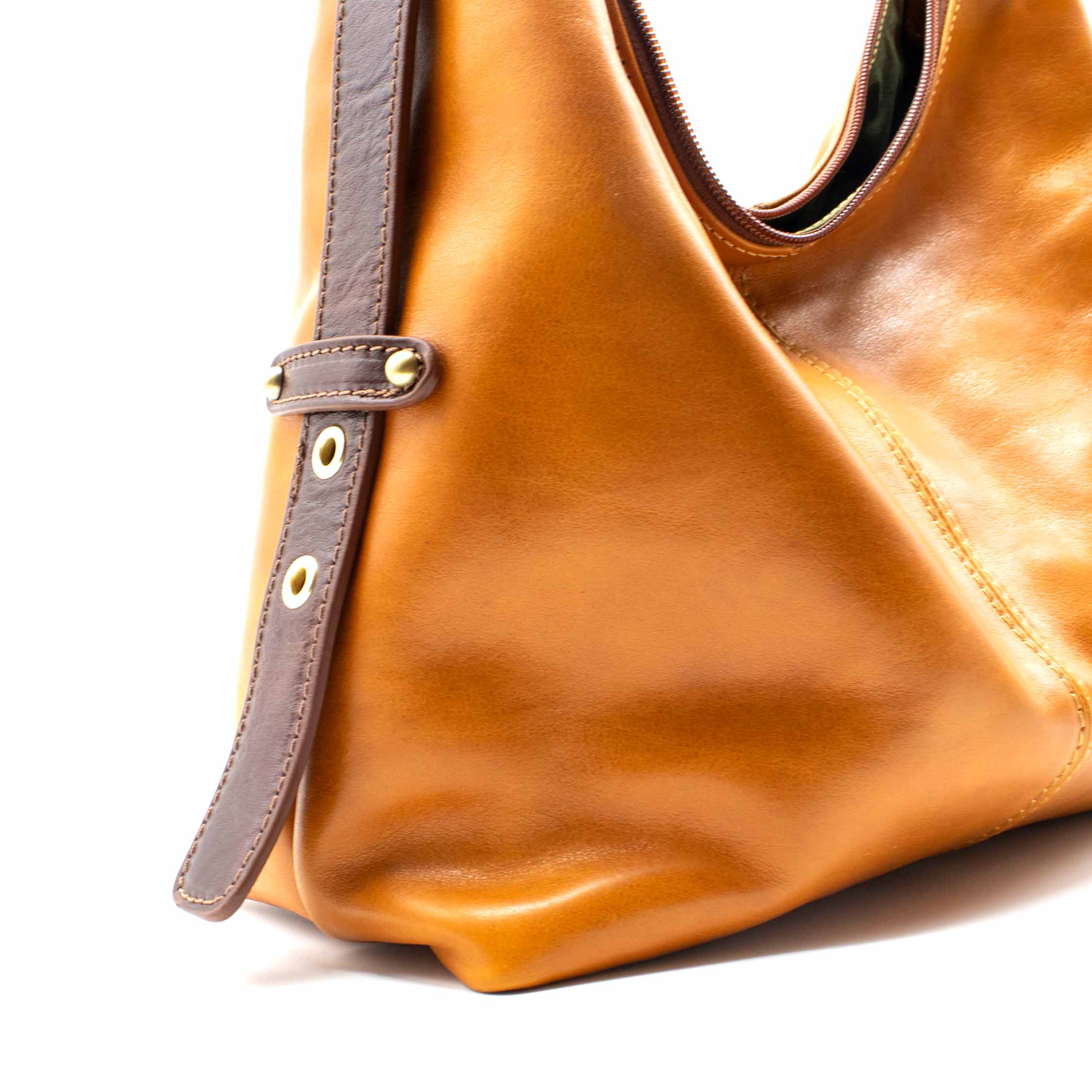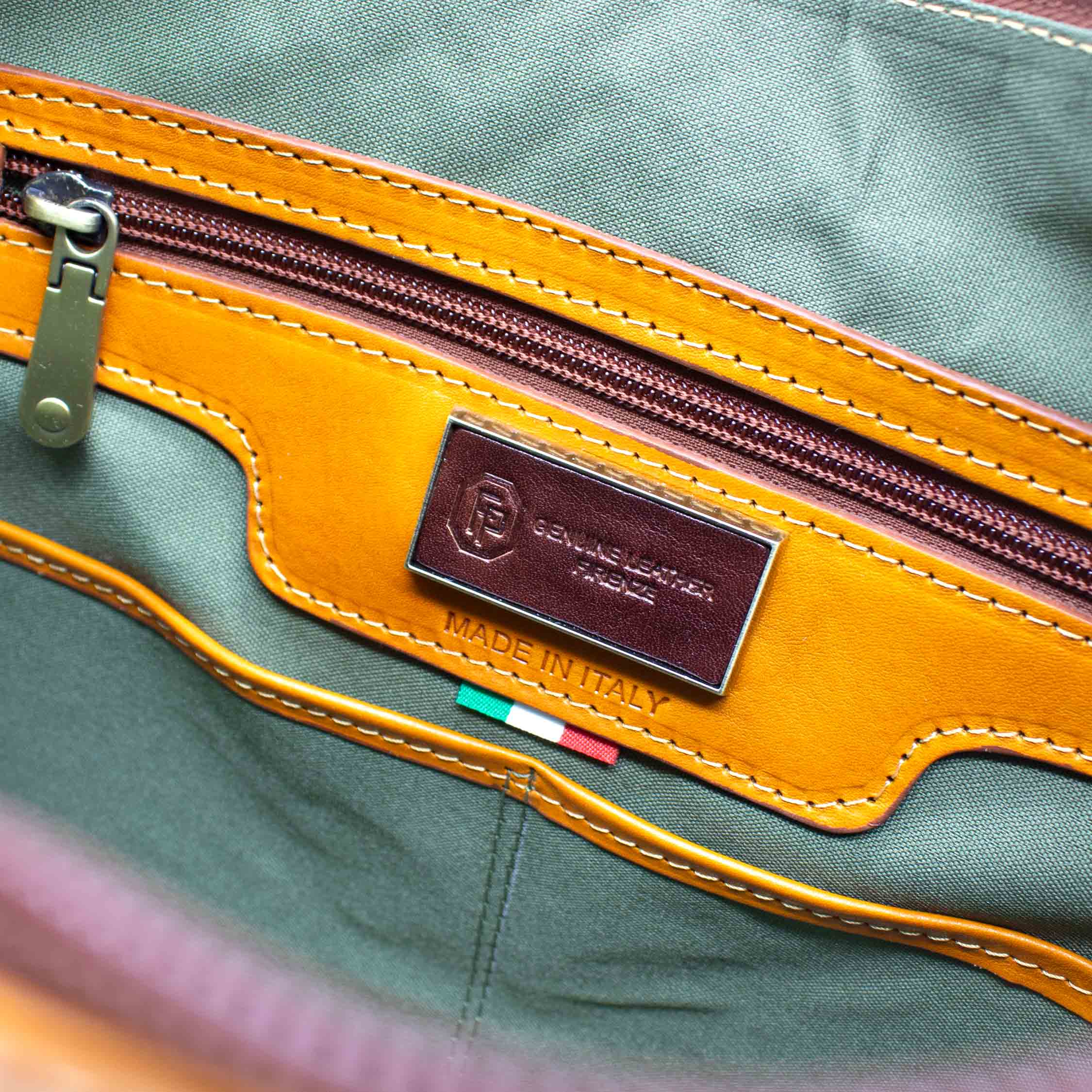 La pelle è tinta al vegetale con estratti naturali, tra cui mimosa e castagno. Questo processo tipicamente toscano consente al colore di modificarsi con l’uso e con l’esposizione alla luce, trasformando ogni borsa in un pezzo unico che racconta la propria storia.