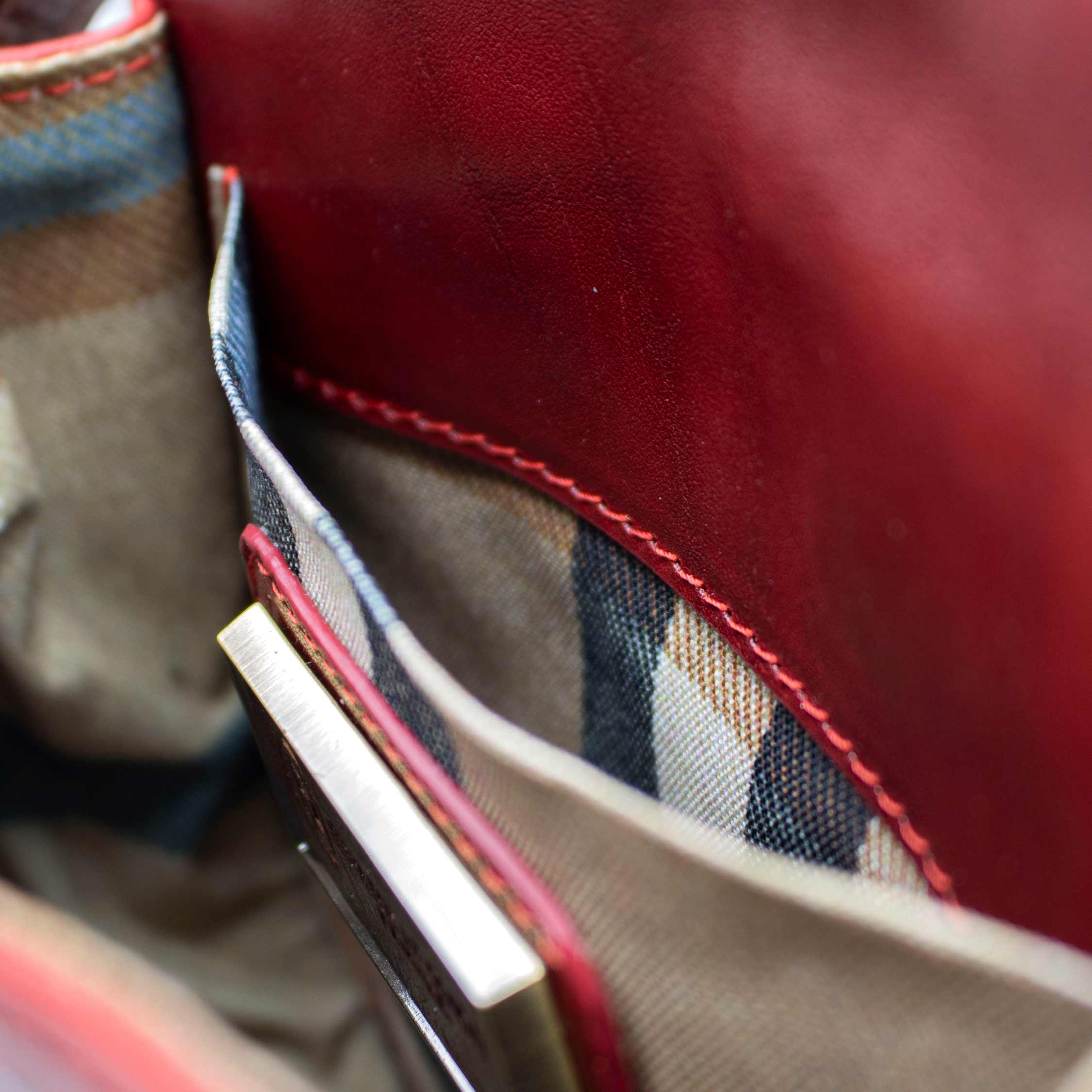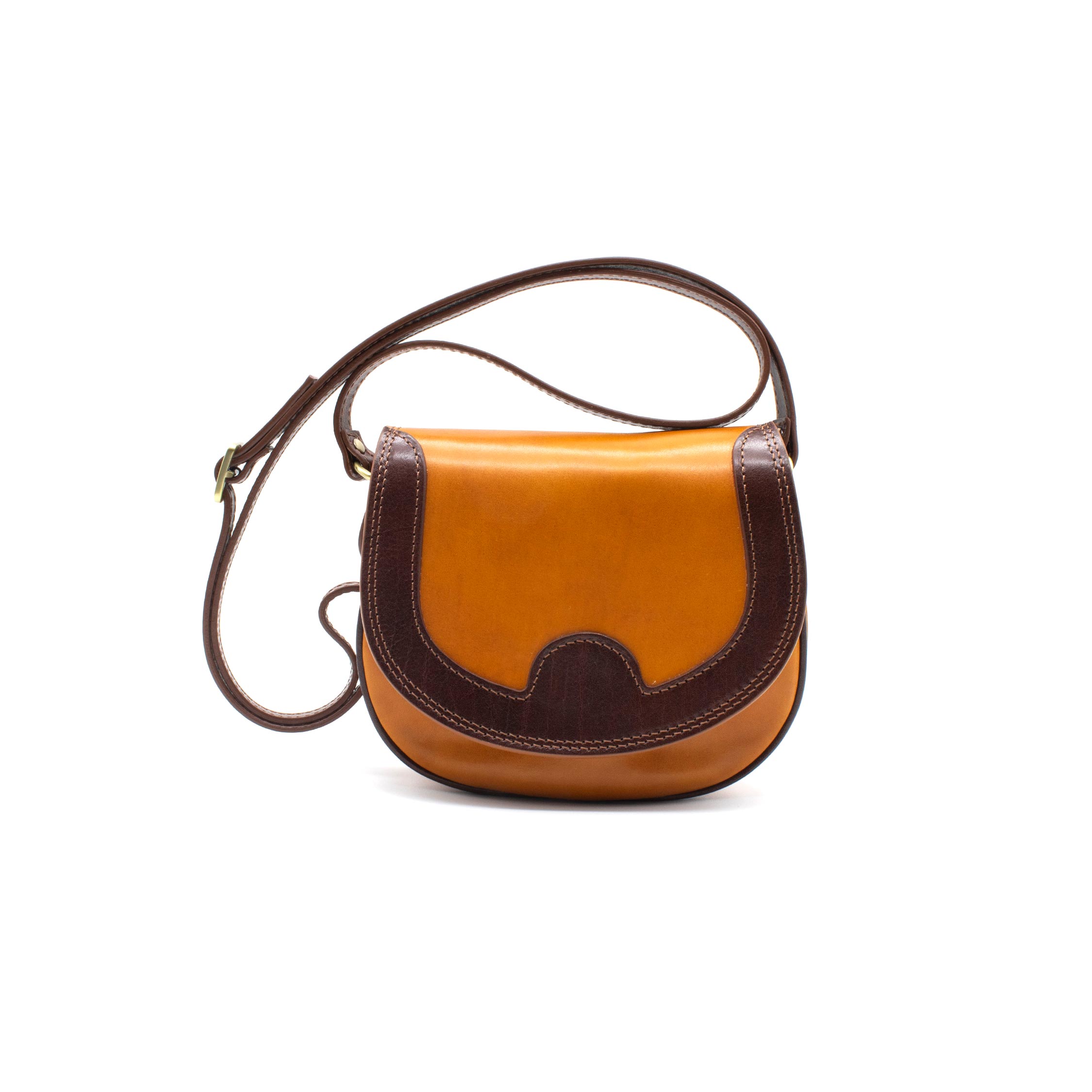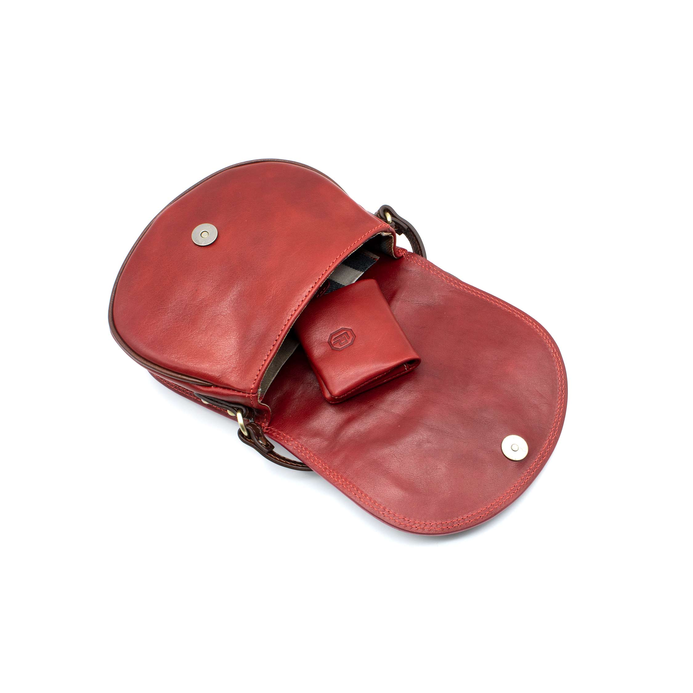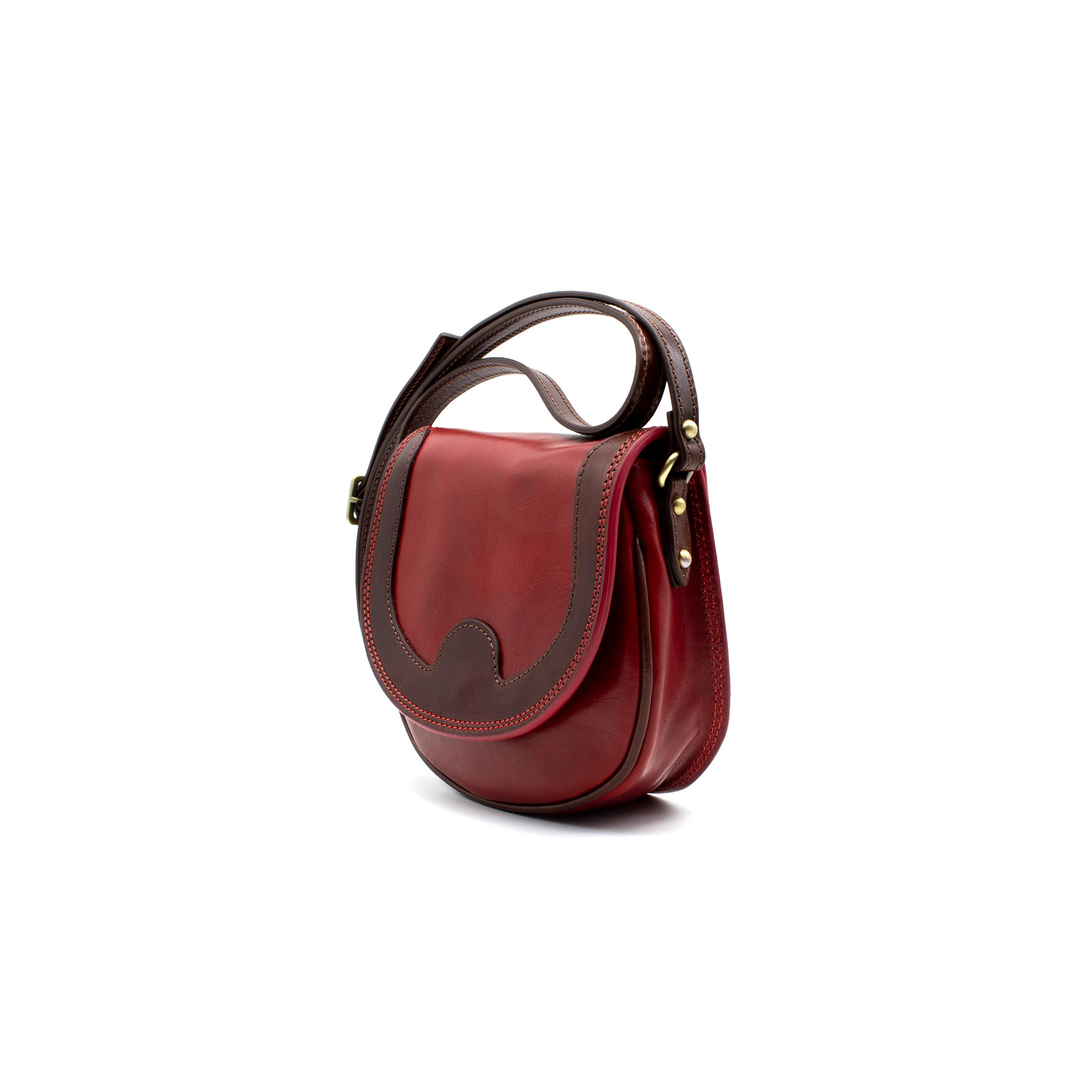 La borsa si apre tramite una pattina con chiusura magnetica e all’interno presenta uno scomparto principale capiente e un piccolo slot aperto, ideale per riporre oggetti di utilizzo quotidiano come porta carte di credito o porta monete. La tracolla regolabile, anch’essa realizzata a mano in vacchetta, permette di indossarla comodamente sia a spalla sia a tracolla.